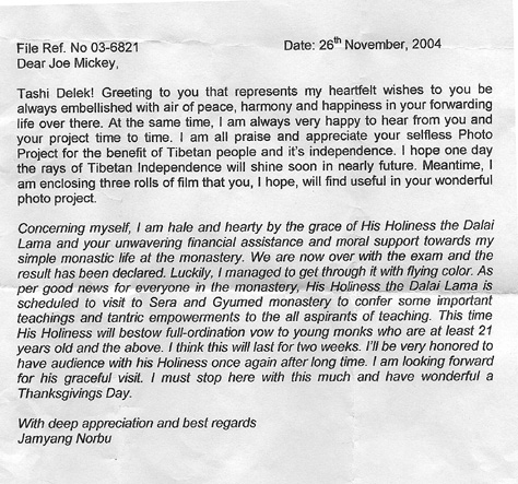 recent letter, dated May 6, from Jam Yang Norbu who lives at the